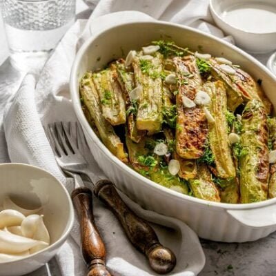 4 Done | Pasul 4Peștele ar trebui scos periodic din cuptor și stropit cu sosul din tavă, pentru a se impregna mai bine. Dacă este nevoie, poți adăuga și câteva linguri de apă. Pește la cuptor cu cartofi și ierburi aromate Felicitări! Ai gătit pește la cuptor! Servește-l cald, împreună cu verdeață și poate puțin mai multă zeamă de lămâie, dacă crezi că este nevoie. De asemenea, un mujdei de usturoi și o salată verde sunt perfecte alături. Și nu uita de cartofii la cuptor - sunt garnitura ideală pentru o porție de pește la cuptor! |